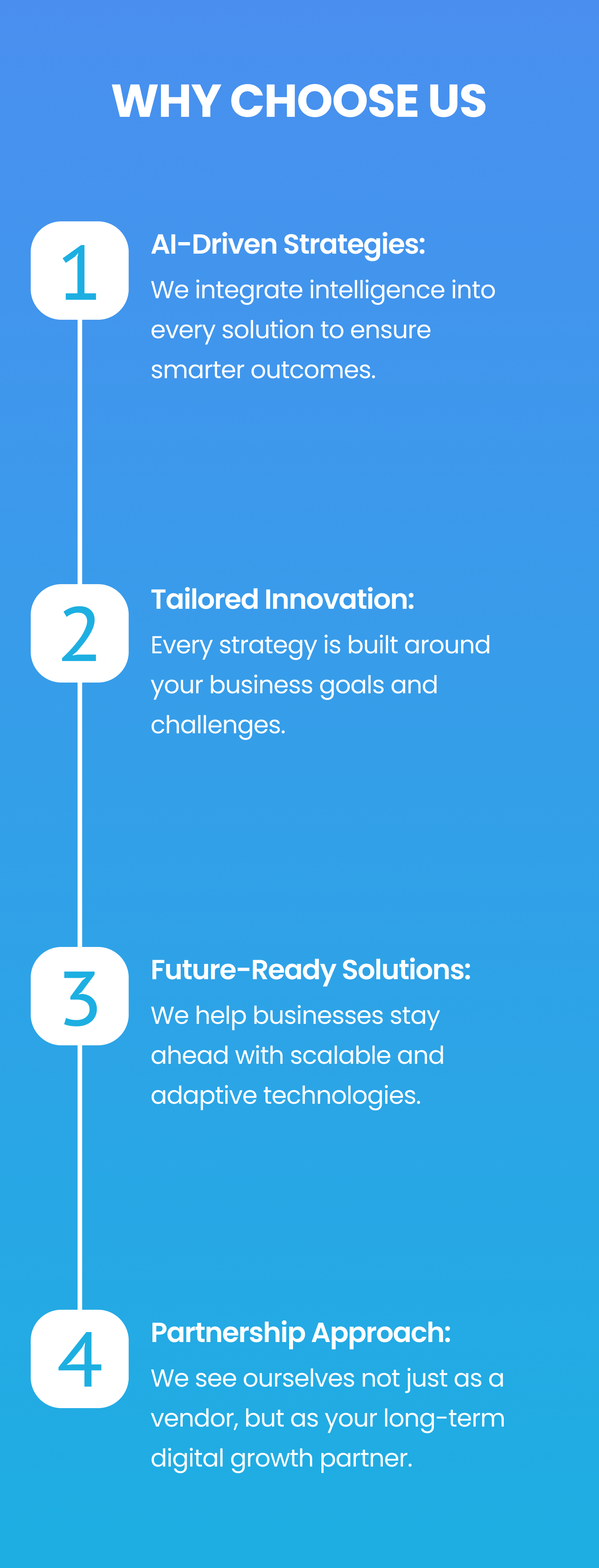 To be the most trusted global partner in AI and digital transformation, providing innovative solutions and cutting-edge technologies that empower businesses to thrive in the ever-evolving digital landscape.